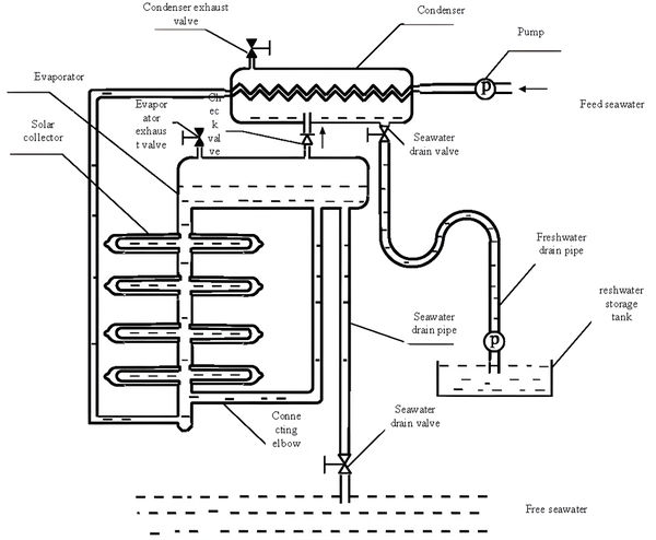 The system operates as follows: a water supply pump injects seawater into the evaporator at a height exceeding 10m, and then the exhaust valve expels the seawater in the evaporator. This creates a vacuum in the evaporator by the principle of atmospheric pressure supporting a 10m water column. Subsequently, the raw seawater is condensed by the condenser, recovering the latent heat of condensation. It then enters the constant temperature water tank, where it is reheated by the solar collector, and finally reaches the evaporator. To achieve convective heat transfer and enhance heat transfer efficiency, cooling water pipes and hot water seawater inlet pipes are installed on both sides of the evaporator. Under negative pressure, the seawater saturation temperature decreases, and the heated seawater rapidly vaporizes in the evaporator and condenses into fresh water in the upper condenser. The condensed fresh water falls into the pool and flows into the fresh water storage tank through the water pipe by gravity.