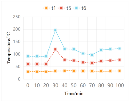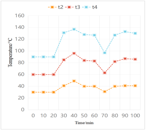 The above experiment used experimental seawater as the raw material and applied a constant temperature control to the hot box using a temperature control box. The preparation process involved inflating and draining the evaporator for about 20 minutes to establish a vacuum inside. After the discharge was completed, the evaporator could generate an internal absolute pressure of about 8 kPa. Figure 5 shows the temperature change of the top outer wall of the evaporator with the temperature, with seawater heated to 50°C and a mass flow rate of 0.1 kg/s. The experimental results indicate that the temperature of the outer wall of the evaporator first increases sharply, and then decreases sharply during the second filling process, exhibiting a complete cycle process [10]. When the heated seawater is injected into the evaporator, it undergoes instant boiling when it reaches the saturation temperature corresponding to its internal pressure, with some of the steam being condensed into fresh water in the condenser, while the remaining hot steam and non-condensing gas accumulate at the top of the evaporator under the influence of buoyancy, thereby increasing the temperature and pressure inside the evaporator. It can be observed that the temperature of the evaporator wall () is lower near the cold water inlet, indicating higher cooling efficiency, as cold water differs from hot water.