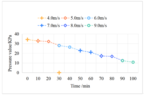 Seawater evaporation under different wind speeds at room temperature (25°C) was investigated using a cylindrical evaporator. The wind speeds were varied incrementally from the previous limit, and the experimental results are presented in Figure 3. As shown in Figure 3, the evaporation rate of seawater increased with the wind speed, matching the pumping rate of the vacuum pump, which resulted in a decrease and stabilization of the air pressure at a certain value. The time required to reach the maximum pressure for each wind speed was shorter than that for the original pressure, as the seawater evaporated faster at lower pressure, replenishing the air pressure more rapidly. The gas pressure reached a steady state in a shorter time span as the evaporation rate increased.