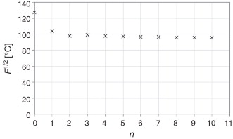 En la figura 4 se muestra gráficamente la raíz cuadrada de la función costo (F ) en cada iteración (n ), para el problema considerado. Se observa que en las 2 primeras iteraciones la magnitud de F1/2 disminuye significativamente respecto al valor inicial, pasando de un valor de 127,8 a 97,7°C (tabla 2 ). A partir de aquí, el valor se mantiene aproximadamente constante.