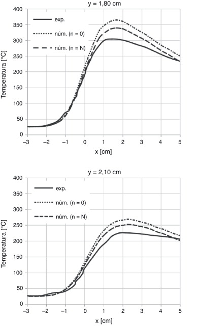 En la figura 6 se comparan las temperaturas medidas experimentalmente (exp.) y las del modelo numérico (num.), obtenidas con los valores de los parámetros inicial (n = 0) y final (n = N ), a 2 distancias distintas de la línea de unión: y = 1,80 cm y y = 2,10 cm.