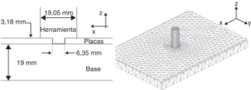 La geometría del modelo se compone de la herramienta, de las piezas que soldar y de la placa base (fig. 2 ). La forma y las dimensiones de la herramienta, así como el espesor, el ancho y la longitud de las piezas por soldar y de la placa base, se corresponden con las de los datos del trabajo de Zhu et al. [9] .