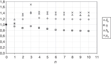 En la figura 5 se muestra gráficamente el valor que toman los 4 parámetros (δ0 , η , μ0 y hb ), cada uno dividido por su valor inicial, en cada iteración (n ), para el problema considerado.