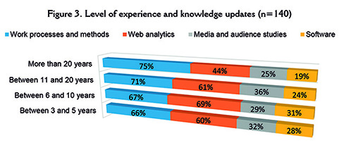 In relation to the knowledge acquired or updated for their usual work, those derived from new work processes (82%) and web analytics (73%) stood out. Respondents mentioned knowledge about media and audience studies to a lesser extent.