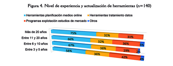 El análisis de los cambios producidos en el perfil de los planificadores con relación a su experiencia mostraba que a mayor trayectoria en el sector, mayor exigencia en la ampliación o renovación de conocimientos sobre nuevos procesos y metodologías de trabajo. Una necesidad prioritaria para todos los rangos estudiados es el de incrementar los conocimientos sobre la analítica web, aunque con poca diferencia respecto a la inquietud en los procesos y métodos de trabajo.