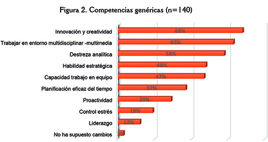 Regarding the generic skills, respondents stressed innovation capacity and the need to adapt media function to a more multidisciplinary and multimedia framework, typical of the global and digital environment (Figure 2). Within client service teams there are specialists from different disciplines of digital communication (SEO, SEM, mobile...), as well as more statistical or mathematical profiles, responsible for the data sector. Multidisciplinarity is a relevant aspect that the experts also explained during the interviews: