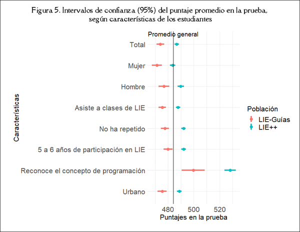 En una primera exploración, se encontró que los estudiantes de LIE++ mostraron mejor desempeño en la prueba que el grupo de LIE-Guías (Figura 5)3. Esta diferencia entre los grupos se mantiene en los estudiantes de LIE++ si son de zona urbana, si no han repetido, si poseen mayores años de participación en Informática Educativa (5 o 6 años) y si han asistido regularmente a estas, y si reconocen correctamente el concepto de programación. Dicha tendencia se mantiene indiferentemente del sexo.
