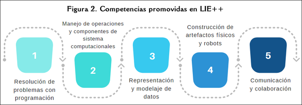 En segundo lugar, LIE++ promueve una dinámica de trabajo que hace uso de la computación física y el trabajo en equipo entre los estudiantes, tratando de generar un espacio práctico y de entretenimiento al construir artefactos físicos y robots. Sobre esto, Sullivan y Bers (2018) y Caballero-González y García-Valcárcel (2020) señalan que varias experiencias que usan la robótica y la programación favorecen el aprendizaje de conceptos y prácticas de las ciencias de computación e ingeniería, y a su vez, permiten mayor involucramiento de los estudiantes, incluso desde edades tempranas.