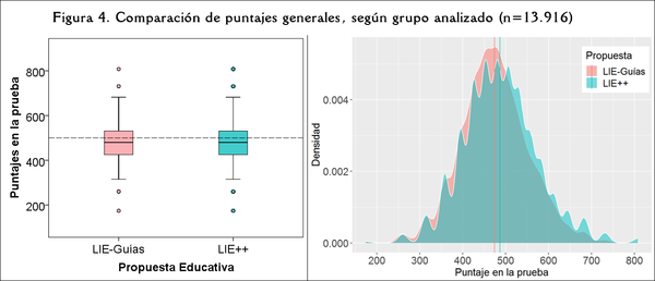 A pesar de que los puntajes promedio de ambos grupos no sobrepasaron la media de la escala (X=500), se evidenciaron diferencias significativas entre los dos grupos (Figura 4)2: LIE-Guía, 474,1 (DE=79,2) puntos vs. LIE++, 486,6 (DE=85,0) puntos (F(1,13.914)=53,08, p<0.00).