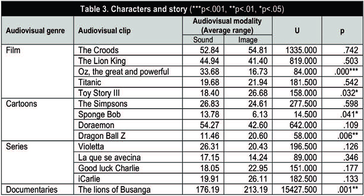 On its part, in the category characters and story, differences were obtained according to the audiovisual modality employed in the different audiovisual genres, except for the genre Series. More specifically, in the genre of films, the assessment by the children was higher in the modality of Sound for “Oz, the great and powerful” while in “Toy Story III”, the best assessment was found in the modality of Image. Similar results were found in the genre of cartoons, where in “Sponge Bob” the modality of Sound was prioritized, while in “Dragon Ball Z”, Image was prioritized. Also, in the genre Documentaries, the Image predominated over Sound.