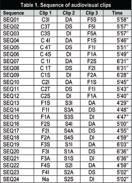Cada uno de los clips se editó en tres versiones: sonido (S), imagen (I) o todo (T). Así, los niños de cada clase eran expuestos a una secuencia formada por tres clips, cada clip con una versión diferente (S, I o T). La secuencia podía ser, en función del género audiovisual, dibujos-reportaje-película (secuencias 01 a 12) o película-serie-reportaje (secuencias 13 a 24). En la Tabla 1 se muestra cada secuencia. El primer elemento de cada clip se refiere al género audiovisual, esto es, p=película, d=dibujos, s=serie, r=reportaje. El segundo elemento, en el caso de tres elementos, es el número relativo a la película, dibujos o serie en cuestión. Por último, el tercer elemento (o segundo cuando solo haya dos) es el relativo a la versión audiovisual, es decir, s=sonido, i=imagen, t=todo.