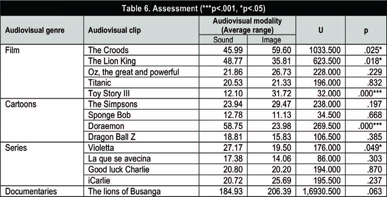 In the last category, Assessment, there were differences between Sound and Image in the genres of films, cartoons and series. Within films, in “The Croods” and “Toy Story III”, there were higher assessments in the modality Image. However, in “The Lion King”, the scores were higher for Sound. In the cartoons “Doraemon” and in the series “Violetta”, the audiovisual modality of Sound also predominated.