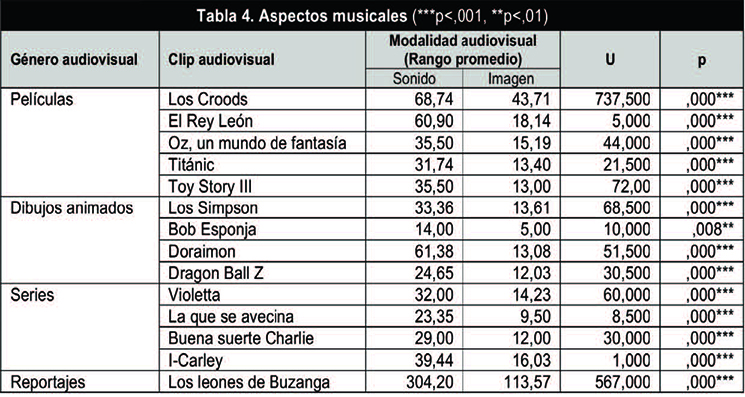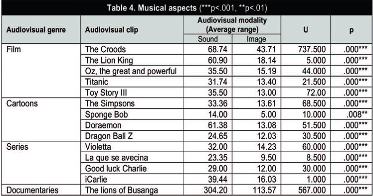 As for the musical aspects (Table 4), the differences were significant in all the audiovisual media clips when analyzing the modality S as compared to I.