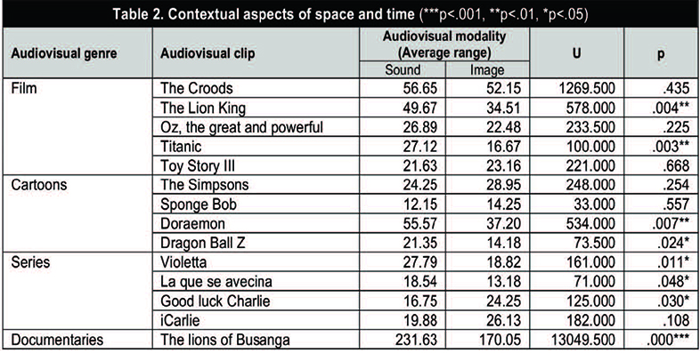 En ocho de los catorce clips se hallaron diferencias, los cuales pertenecían a los cuatro géneros audiovisuales utilizados. De ellos, en siete la apreciación de los aspectos contextuales de espacio y tiempo para la modalidad S fue superior a la de I, concretamente en «El Rey León», «Titanic», «Doraimon», «Dragon Ball Z», «Violetta», «La que se avecina» y «Los leones de Buzanga». Tan solo en la serie «Buena suerte Charlie» la modalidad I superó a S.