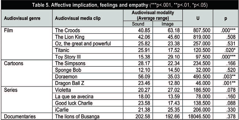 Continuando, en la categoría de implicación afectiva, sentimientos y empatía se hallan diferencias en los géneros de películas y dibujos animados. En las películas «Los Croods» y «Toy Story III» las puntuaciones son superiores para la modalidad imagen, mientras que en «Titanic» y «El Rey León» lo son para el sonido. Por su parte, en los dibujos animados «Doraimon» y «Dragon Ball Z» la valoración es superior en la modalidad de sonido.