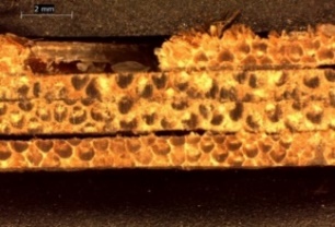 El modo de fallo aparece en la interfase entre la lignina y el PLA. Las tiras de bambú rompen a 45º debido a un estado inicial de pandeo. Se trata de un fallo estándar en materiales compuestos.