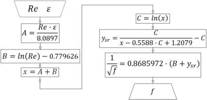 Following the algorithm from Figure 2, Eq. (12) can be executed (it introduces a relative error of no more than 0.00247% and that it needs around 4.4 seconds to execute 8 million of Quasi Monte-Carlo tested samples carefully selected from the domain of the Colebrook equation which is of interest for engineering practice).