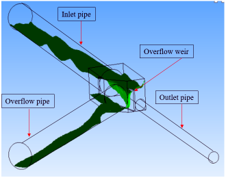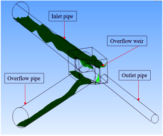 | Figure 4. Behavior of the flow in the inlet and overflow pipe for the CSO of the outlet pipe type – CSO Carrera 8th |