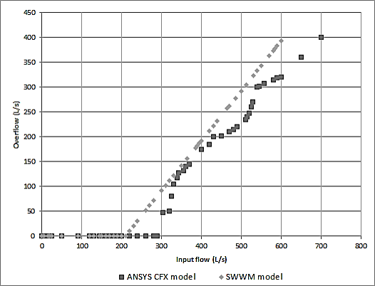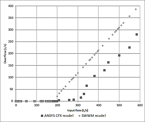 Although the trends between the models have similarities in both CSOs, the SWMM model underestimates the threshold flow, estimating a difference of about 100 l/s, with respect to the ANSYS CFX results.
