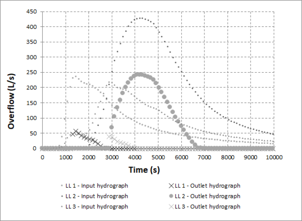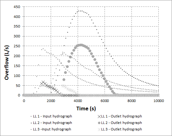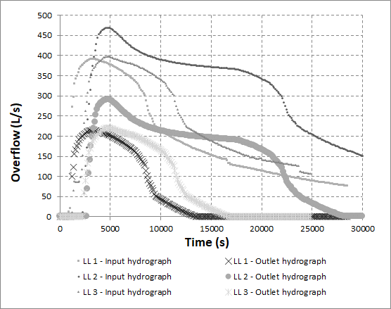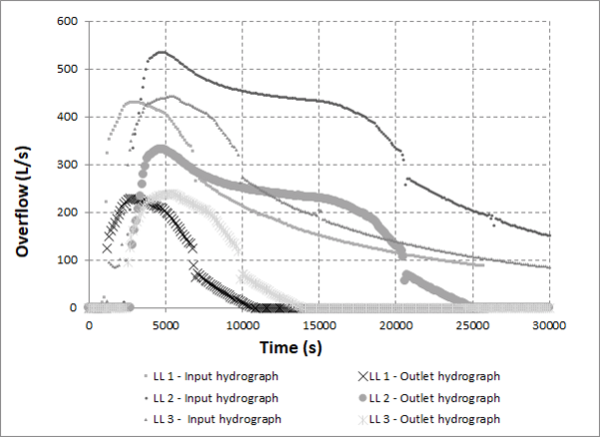 The excess hydrograms in the CSO pipe depend directly on the specific rain event to be modeled, on the geometry of the structure, on the type of CSO, and on the shape and distribution of the inlet hydrograms. From Figure 3 to Figure 6 it can be seen how the rainfall hydrogram conserves the trend and distribution of the input hydrogram in each particular structure.