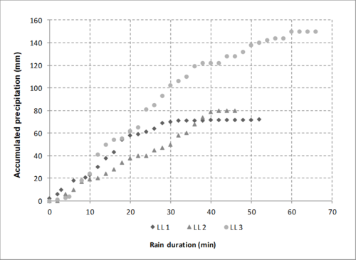 Figure 1 shows the cumulative distribution of simulated rainfall in the basin. Precipitation data associated with rain 1 corresponds to data taken in a field visit in the basin. In the case of rains 2 and 3, the data is obtained by scaling the values of rain 1, so that the operation of the CSOs is guaranteed.