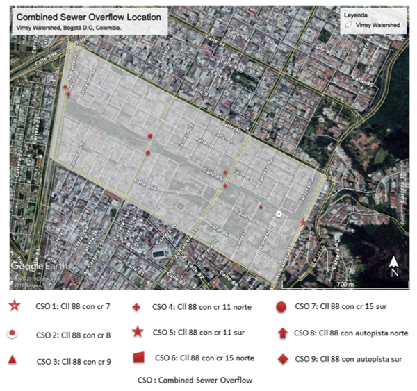The Virrey Basin is located in Bogotá's North-East and it extends in a south-north direction, from the 72nd Street to the 92nd Street; and in the east-west direction, from the eastern hills to the North Highway. This basin has an approximate area of 1369 ha, of which 354 correspond to the hills and 1015 to the urban area. The sewage system is combined with 1096 sections of different types and materials, so the Manning coefficient associated with each of them is variable. In total, the system has 1084 manholes, with depths varying between 0.89 and 7 meters [13].