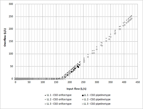 | Figure 7. Comparison of inlet flow vs overflow outlet orifice-type and outlet pipe-type CSOs - Carrera 8th |
