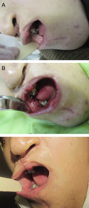 Figure 1. (A) Vertical scar band in buccal mucosa. (B) Multiple z-plasty flaps. (C) Result 3 months after operation. |