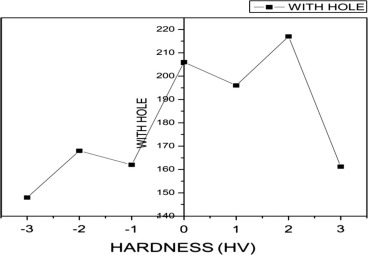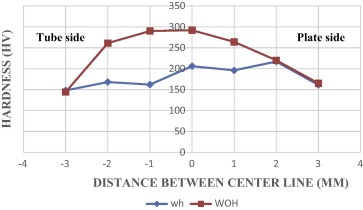 The hardness of the optimal joint strength work piece has been tested at different weld conditions and welding interface hardness possessed hardness value of about 217 Hv. Fig. 26 shows the hardness value of work piece with hole on its circumference. The hardness value at the interface for the work piece with hole is lower when compared to the work piece with hole due to the refinement of the grains at the weld interface and minimum heat generation is produced in between tube to tube plate.