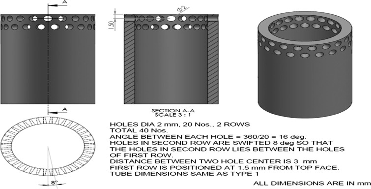 In type 2 conditions, the tube plate is taken as SA 387 and tube is taken as SA 213 having holes of diameter 2 mm on its circumference and Fig. 4 shows the tube with hole [WH]. In total, nine pieces of tube with hole and tube plate assembly were considered and the assembly of the work piece is done provided with the normal fit between them and the projection of tube is given value of 0 mm, 1 mm and 2 mm for three set of pieces. Fig. 5 shows the three sets of work piece and with their projection before welding process.