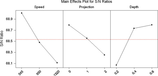 The important features are the joint strength for investigating the quality of FWTPET joints. The mean and Signal-to-Noise (S/N) ratio for the each factor have been calculated to assess the influence of factor on response. The criteria larger the better is considered for selecting the S/N ratio to make the most of response. The MINITAB software was used for determining the influence of process parameters (factors) on the joint strength (response). Table 7 provides the response table for means, and Table 8 provides the response table for S/N ratio. It is clear that a larger S/N ratio corresponds to better quality features. The mean effect and S/N ratio for joint strength were calculated by statistical software are shown in Figure 14 and Figure 15 respectively, indicating that the joint strength was at its maximum, with tool rotational speed of 545 rpm, tube projection of 2 mm, and plunge depth of 0.6 mm.