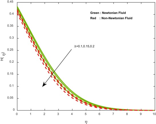 The effects of induced magnetic field parameter on velocity, induced magnetic field and concentration profiles for both Newtonian and non-Newtonian cases are plotted in Fig. 6 , Fig. 7 , Fig. 8 and Fig. 9 . It is noticed that the momentum, thermal and concentration boundary layer thicknesses are enhanced with an increase in the induced magnetic field parameter. Usually an increase in the induced magnetic field develops the electric current. This electric force can help to enhance the momentum and thermal boundary layer thickness. This leads to an increase in the momentum and thermal boundary layer thickness.