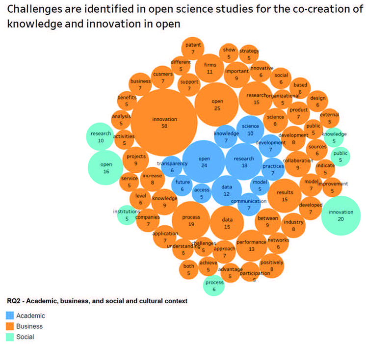 In RQ3: What are the challenges (difficulties, problems, areas of opportunity) for open innovation and the co-creation of knowledge to drive open science? A content analysis was conducted, keywords from the challenges described by the authors in their text descriptions were defined, and these data were cross-referenced with the contexts identified, with the results used to create a diagram in Tableau (Figure 4). The findings show that there was a greater incidence in three great areas: innovation, openness and research, in the more-common contexts (business, academic and cultural).