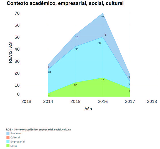 En la pregunta RQ2 ¿Qué contextos (académico, empresarial, social, cultural) han sido objeto de estudio en ciencia abierta? se realizó un análisis de contenido para identificar el sector de la publicación y se diagramó en Tableau, por cantidad el número de artículo, que, a su vez, fueron organizados por año. En la Figura 3 se identifica por color la incidencia de las publicaciones para enunciar datos de los sectores abordados en los artículos: académico, empresarial, social, cultural.