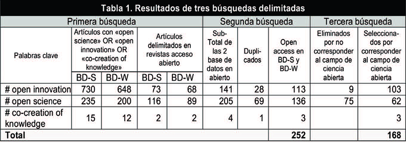 b) Fase 2: Conducción. La fase de conducción se dio para dar respuesta a la RQ1 ¿Cuántos estudios hay en las bases de datos Scopus y WoS acerca de innovación abierta, co-creación del conocimiento abierto y ciencia abierta, desde enero 2014 a mayo 2017, en revistas de acceso abierto? El proceso se dio a través de la evaluación y extracción de los datos de los artículos, siguiendo las recomendaciones de Higgins y Green (2006) de realizarla por al menos dos personas, de forma independiente, siguiendo un protocolo de objetivos de la revisión y piloteados para cada nueva revisión. La primera búsqueda integró las palabras clave en las dos bases de datos (BD-S y BD-W); en la segunda se seleccionaron únicamente los que estaban en revistas de acceso abierto, en relación con los criterios de inclusión u exclusión y se eliminaron los duplicados y, en la tercera vuelta se eliminaron temas de salud y medicina que no tenían relación con ciencia abierta (Tabla 1).