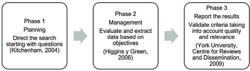To conduct the study, a systematic review of the literature (SRL) was utilized as the strategy for identifying the most relevant studies on the challenges that open innovation and the open co-creation of knowledge have, within the field of open science. The SRL is used to identify, evaluate and interpret the available data within a period from a specific field of research. The process of this revision is based, in general terms, on the guidelines established by Brereton, Kitchenham, Budgen, Turner, and Khalii (2007), focused on the conducting of SRL in software engineering, and in specific terms, on the contributions by Higgins and Green (2006), Kitchenham (2004), Centre for Reviews and Dissemination de York University (2009). The three phases of the review are shown in Figure 1.
