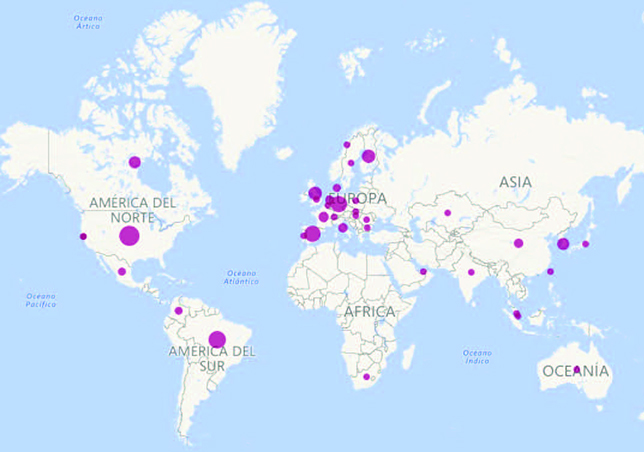 From the 168 articles, the countries that had the greatest number of publications were: United States (18), Brazil (15), Germany (13), Spain (13), Finland (11) and the United Kingdom (10). Figure 2 shows the geographical distribution, where the size of the circles graphically indicates the number of publications that each country has generated.