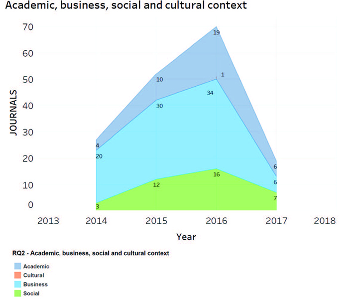 In RQ2: What contexts (academic, business, social, cultural) have been chosen as the object of study in open science? Content analysis was conducted to identify the publication’s sector. The results were drawn in Tableau, by number of articles, which at the same time, were organized according to the year. Figure 3 uses colour to identify the occurrence of the publications to outline data on the sectors addressed in the articles: academic, business, social and cultural.