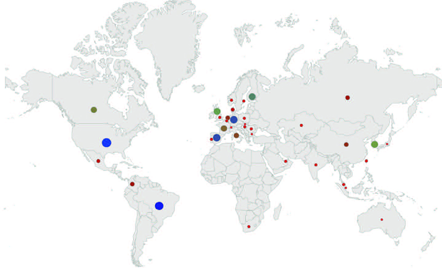 De los 168 artículos, los países que cuentan con mayores publicaciones son: Estados Unidos (18), Brasil (15), Alemania (13), España (13), Finlandia (11) y Reino Unido (10). En la Figura 2 se representa la distribución geográfica, donde el tamaño de los círculos expone gráficamente la cantidad de publicaciones que se han generado.