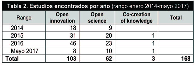 • RQ1 ¿Cuántos estudios hay en las bases de datos Scopus y Web of Science (WoS) acerca de innovación abierta, co-creación del conocimiento abierto y ciencia abierta, desde enero del 2014 a mayo de 2017, en revistas de acceso abierto?