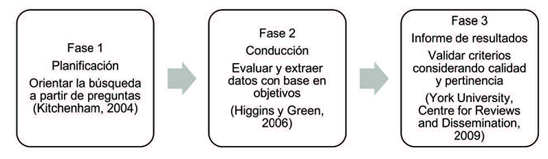 Para llevar a cabo el estudio se utilizó una revisión sistemática de literatura (SLR) como estrategia para identificar los estudios más relevantes acerca de los retos que tiene la innovación abierta y la co-creación del conocimiento en abierto, dentro del campo la ciencia abierta. Las SLR se emplean para identificar, evaluar e interpretar los datos disponibles dentro de un periodo de tiempo de un determinado campo de investigación. El proceso de esta revisión está sustentado, en términos generales, en las directrices establecidas por Brereton, Kitchenham, Budgen, Turner y Khalii (2007), enfocadas en la realización de SLR en ingeniería de software y, en términos particulares, en los aportes de Higgins y Green (2006), Kitchenham (2004), Centre for Reviews and Dissemination de York University (2009). Las tres fases de la revisión se muestran en la Figura 1.