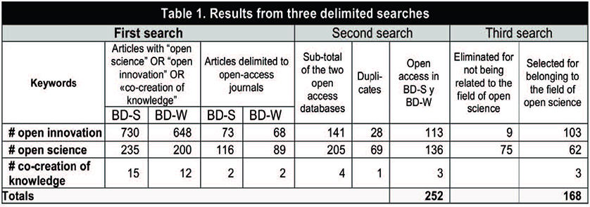 b) Phase 2: Management. The management phase was conducted to provide answers to RQ1: How many studies are there in the SCOPUS and Web of Science (WoS) databases on open innovation, co-creation of open knowledge and open science, from January 2014 to May 2017, in open access journals? The process, following the recommendations by Higging and Green (2006) was comprised of the evaluation and extraction of the article’s data by two people, independently and following a protocol of objectives of the review and steered for each new review. The first search included the keywords in both databases (DB-S and DB-W); in the second search, only the articles that were found in open access journals, as related to the inclusion and exclusion criteria, were selected, and the duplicates were eliminated. In a third round, health and medicine subjects were eliminated, as they did not have any relation to open science (Table 1).