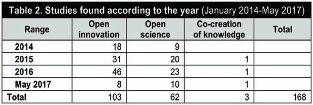 • RQ1 How many studies are there in the Scopus and Web of Science (WoS) databases on open innovation, co-creation of open knowledge and open science, from January 2014 to May 2017, in open access journals?