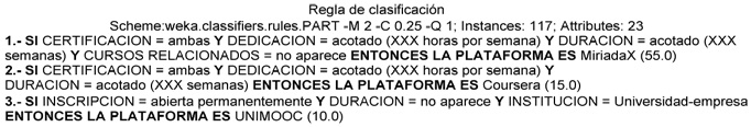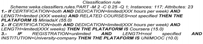 Para argumentarlo más, se han sometido los datos recogidos a un algoritmo de clasificación con el programa Weka (Hall & al., 2009). Teniendo en cuenta que estamos ante una colección de algoritmos de aprendizaje automático para tareas de minería de datos, se toma como variable clasificatoria las plataformas estudiadas, obteniendo como resultado un conjunto de diez reglas que clasifican al 100% de los cursos en su plataforma. El algoritmo utilizado ha sido PART (Frank & Witten, 1998), una variante del C4.5 de Quinlan (1993). A modo de ejemplo se muestra un fragmento de tres reglas del algoritmo: