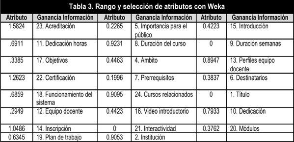 Para examinar qué componentes son más propios del curso que de la plataforma, se han sometido los datos a un algoritmo implementado en Weka que evalúa el valor de cada atributo mediante la medición de la ganancia de información3 (Witten, Frank & Hall, 2011) con respecto a la clase plataforma (tabla 3).