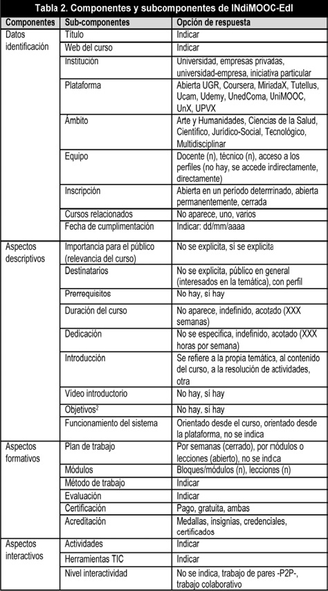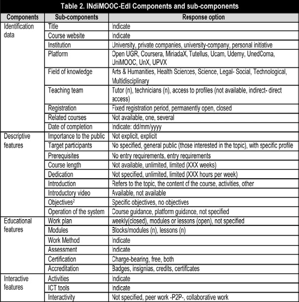 Para el análisis de los cursos masivos se elabora en este estudio INdiMOOCEdI (Instrumento de Indicadores Educativos e Interactivos en un MOOC). Se trata de una ficha ad hoc que recoge de forma exhaustiva la información ofertada como carta de presentación de los MOOC. Los elementos que configuran dicho instrumento se pueden organizar en cuatro componentes, con un total de 27 subcomponentes medidos en varias escalas (tabla 2).