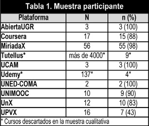 Por tanto, estas dos plataformas no se tienen en cuenta para la determinación de la muestra cualitativa. Así se puede confirmar que los 104 cursos restantes significan el 81.25% de la población.