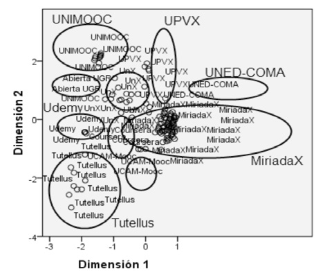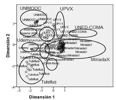 A través de los datos obtenidos se constata que la varianza explicada por estos dos componentes no es mucha (s2=10,64%), pero pone de manifiesto la gran diferencia entre los cursos pertenecientes a una u otra plataforma. En la primera componente saturan las variables certificación (.943), dedicación (.905), dedicación de horas (.899), institución (.883), inscripción (.872) y acreditación (.864). Las variables que saturan en la segunda componente son: vídeo introductorio (.717), equipo docente (80.625), perfiles del equipo docente (.608) y módulos (.629). Aun cuando existen variables que no saturan significativamente en ninguna componente, sí es cierto que la gran mayoría presentan valores contrapuestos en una u otra. Se observa en la proyección de los dos componentes en un eje de coordenadas, cómo los cursos se agrupan en función de la plataforma en la que se ubican. Este resultado pone de manifiesto los siguientes hechos: