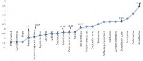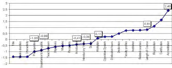 It is noted that most of the information provided by the variables is related to the platform. The title and interactivity variables do not display any variance; hence it can be attributed neither to course or platform. Figure 4 shows the values obtained through the algorithm once standardized. If negative values are to be taken as typical course variables, the following should be considered: Field, Introductory Video, Introduction, Target participants, Modules, Objectives, Teaching team, Importance to the public, Prerequisites and Lenght/weeks. If we increase to a DT=-1, the typical course variables would be Weeks and Prerequisites.