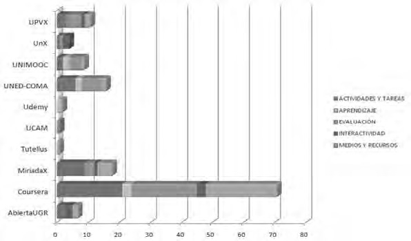 Regardless of the number of courses within each platform, it is noted that Coursera offers higher quality information with regard to educational and interactive features, followed by MiriadaX and UNED-COMA. On the other hand, and except in the aforementioned three platforms, it is observed that platforms are more vulnerable to and deficient in features such as means and resources, activities, tasks and assessment.